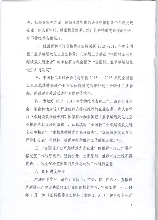 | 1、 | 关于开展2012—2013年度全国轻工业卓越绩效先进企业推荐表彰工作的通知 |