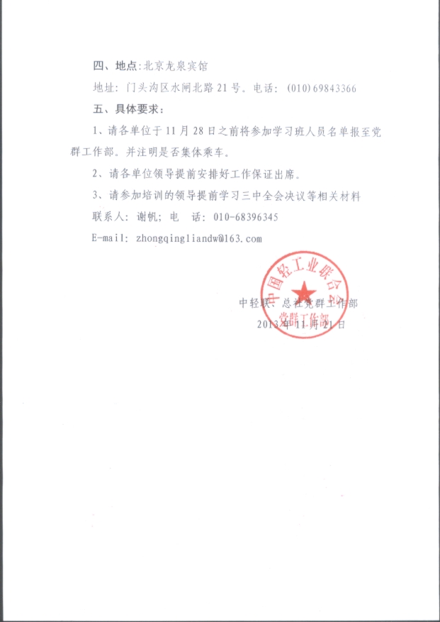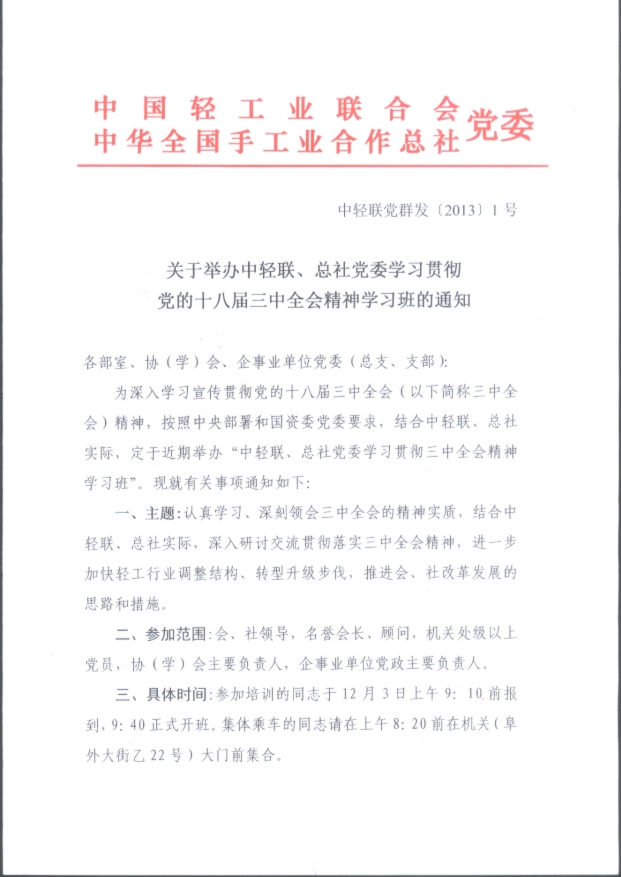 关于举办中轻联、总社党委学习贯彻党的十八届三中全会精神学习班的通知