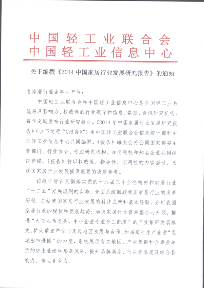 关于编撰《2014中国家居行业发展研究报告》的通知