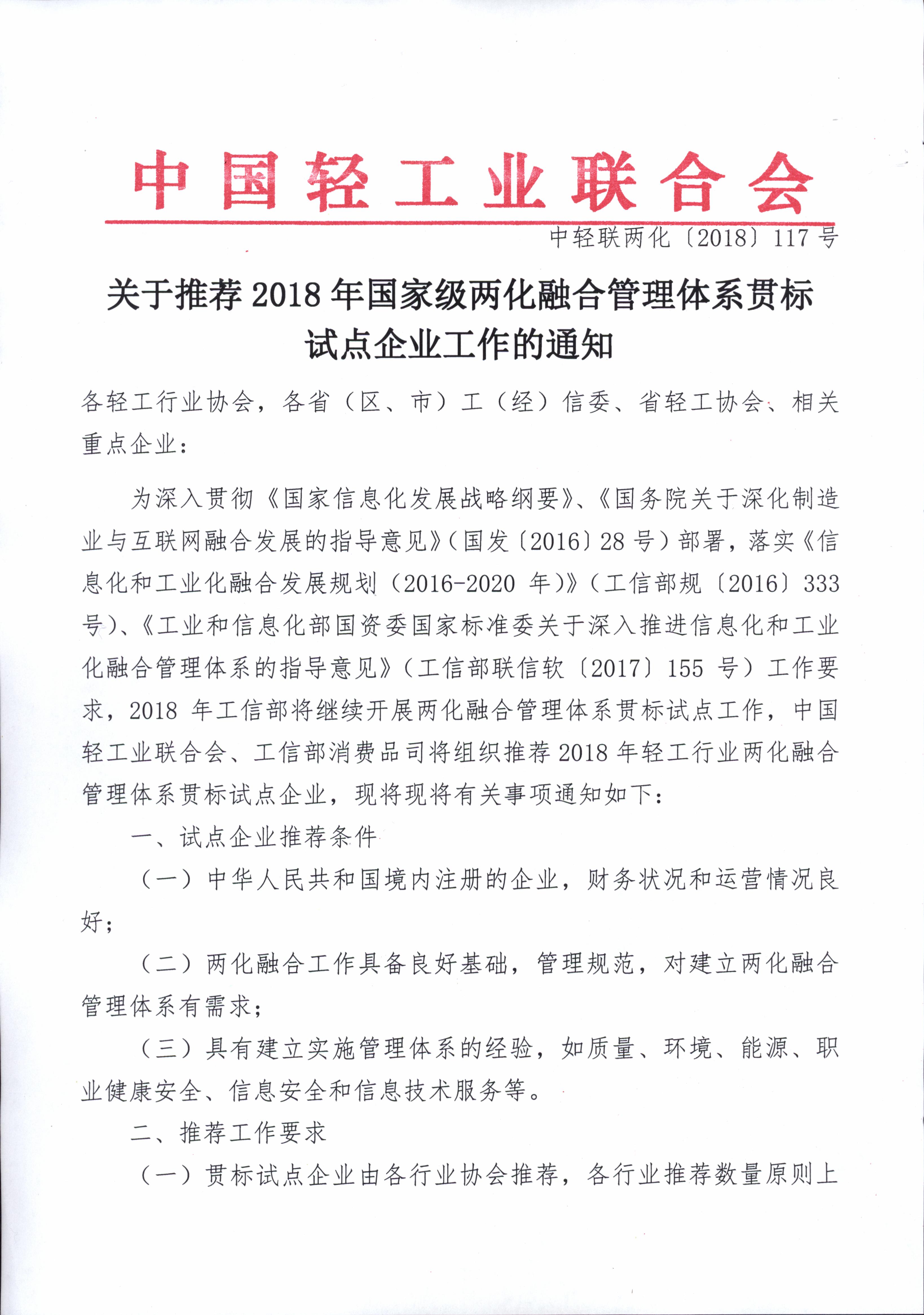 2018年国家级两化融合管理体系贯标试点企业推荐工作启动