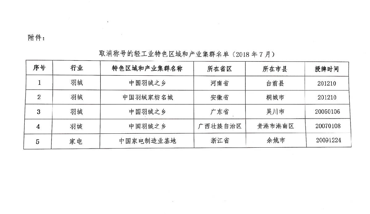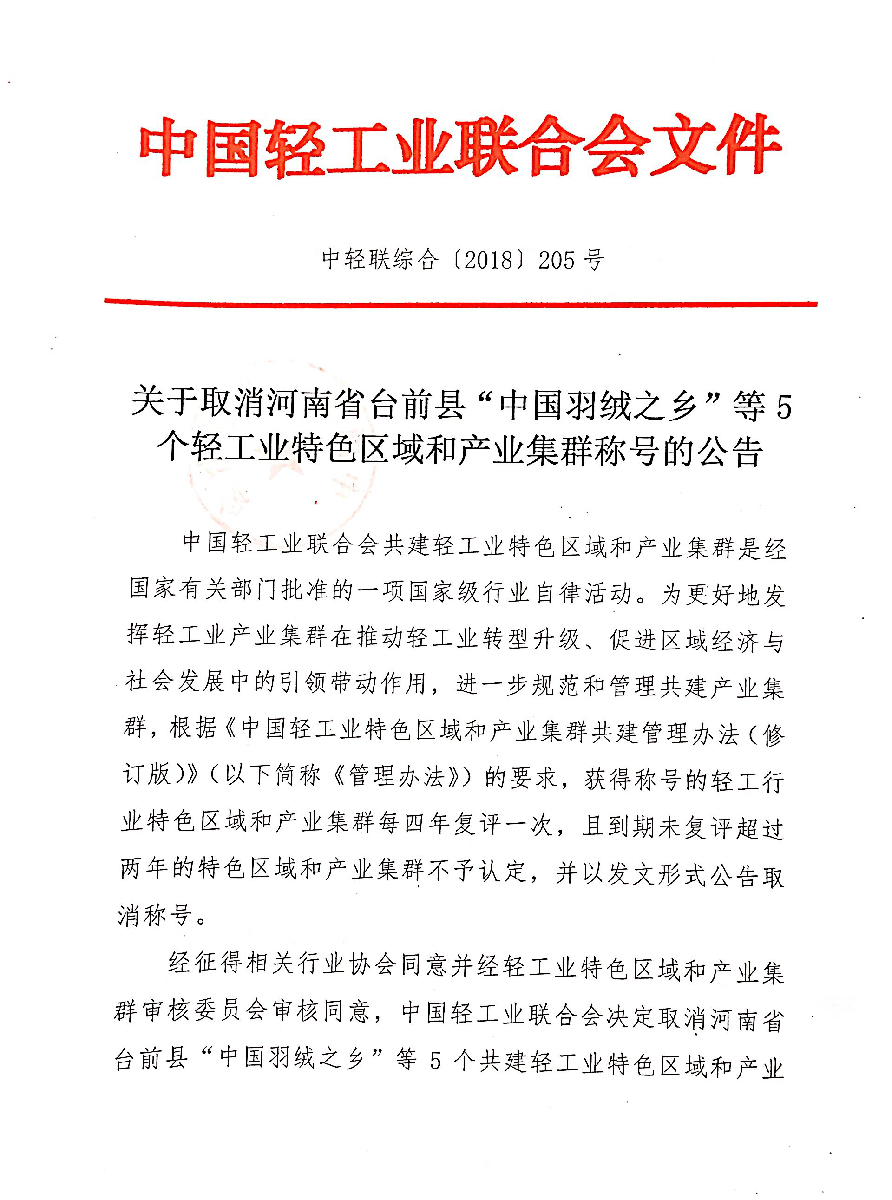取消“中国羽绒之乡”等5个轻工业特色区域和产业集群称号的公告