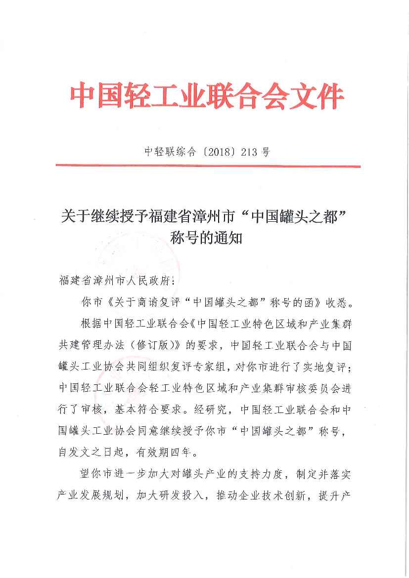 关于继续授予福建省漳州市“中国罐头之都”称号的通知