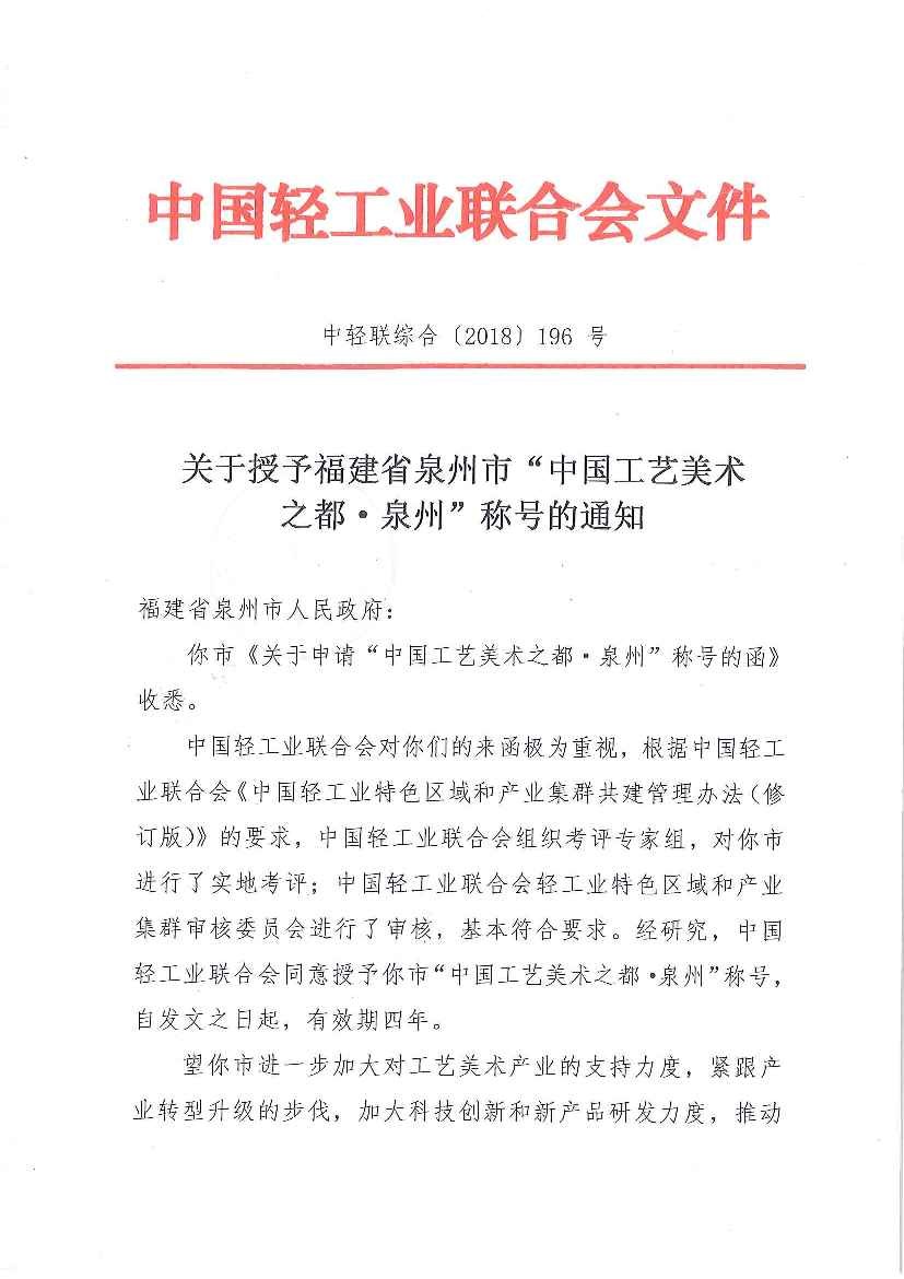 关于授予福建省泉州市“中国工艺美术之都•泉州”称号的通知