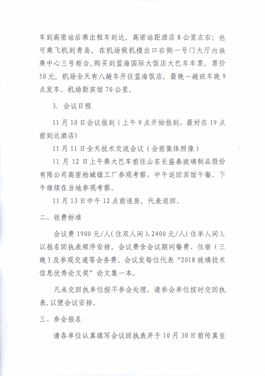 会议还将公布经专家组评审的“2018玻璃技术信息优秀论文奖” 获奖名单并对获奖人员进行表彰。会后安排参观山东长盛泰玻璃制品股份有限公司高密生产工厂, 这次会议又为大家提供了一次极好的现场技术交流机会。希望各单位大力支持并积极参加。为搞好此次活动,现将会议具体事项通知如下: