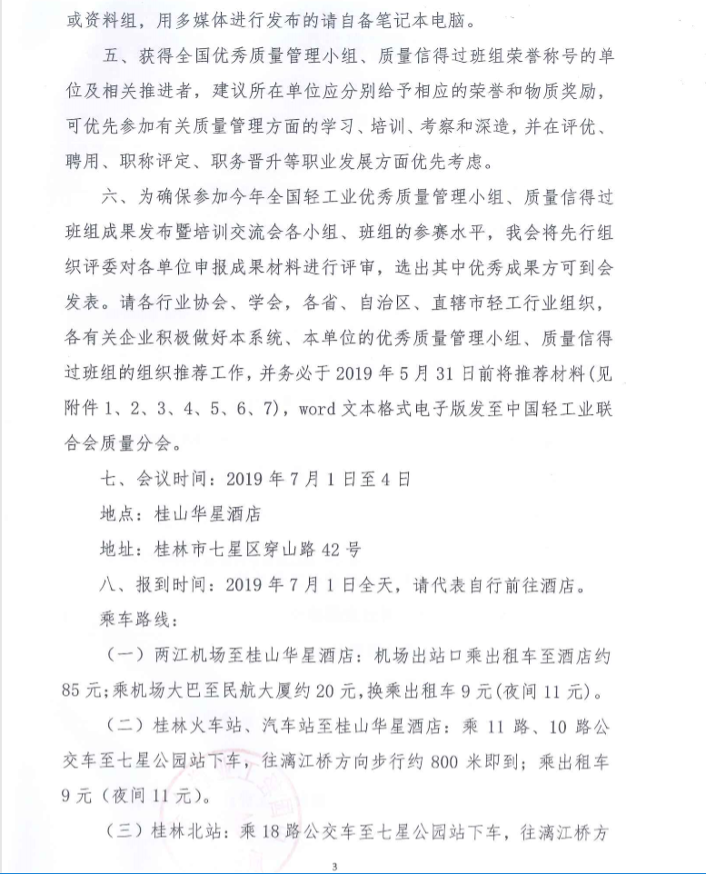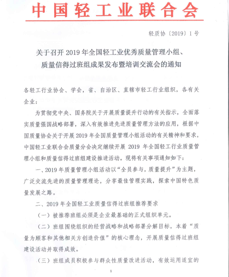 关于召开2019年全国轻工业优秀质量管理小组、质量信得过班组成果发布暨培训交流会的通知
