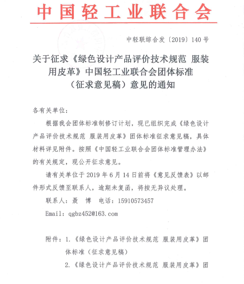 | 1、 | 《绿色设计产品评价技术规范 服装用皮革》团体标准(征求意见稿) |