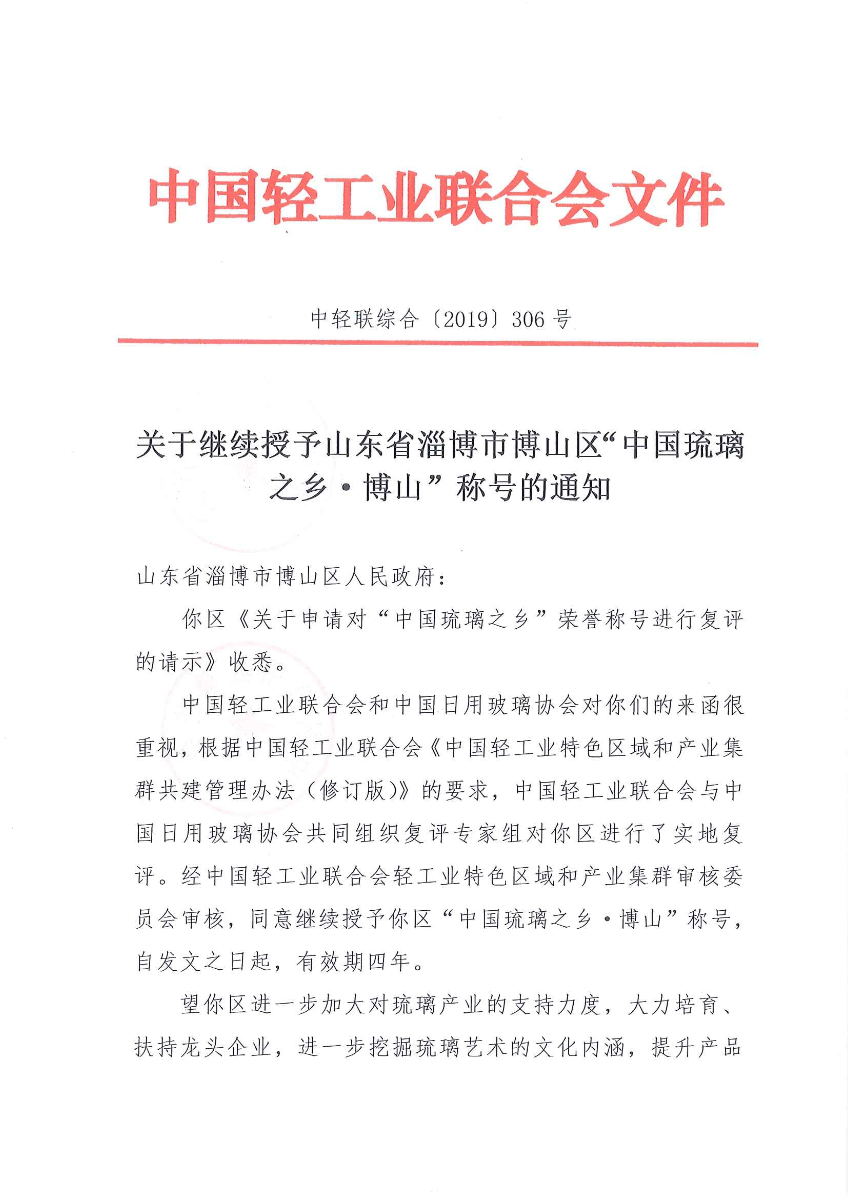 关于继续授予山东省淄博市博山区“中国琉璃之乡·博山”称号的通知