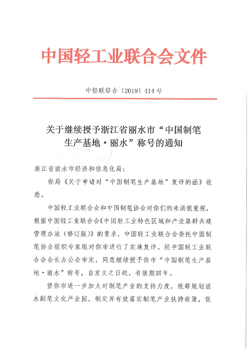关于继续授予浙江省丽水市“中国制笔生产基地·丽水”称号的通知