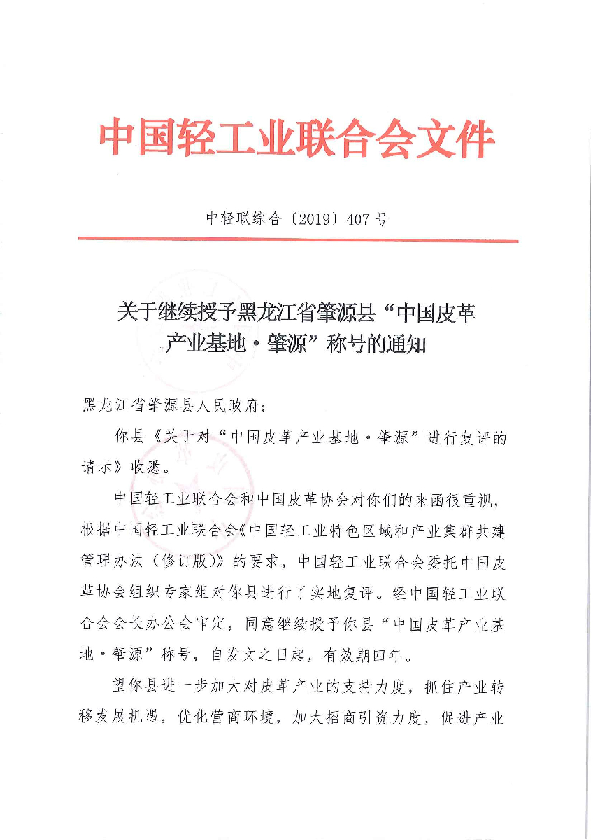 关于继续授予黑龙江省肇源县“中国皮革产业基地·肇源”称号的通知