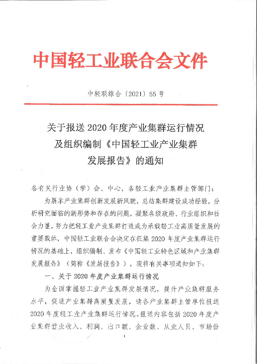 关于报送2020年度产业集群运行情况及组织编制《中国轻工业产业集群发展报告》的通知