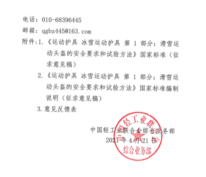 关于征求《运动护具 冰雪运动护具 第1部分:滑雪运动头盔的安全要求和试验方法》国家标准(征求意见稿)意见的函