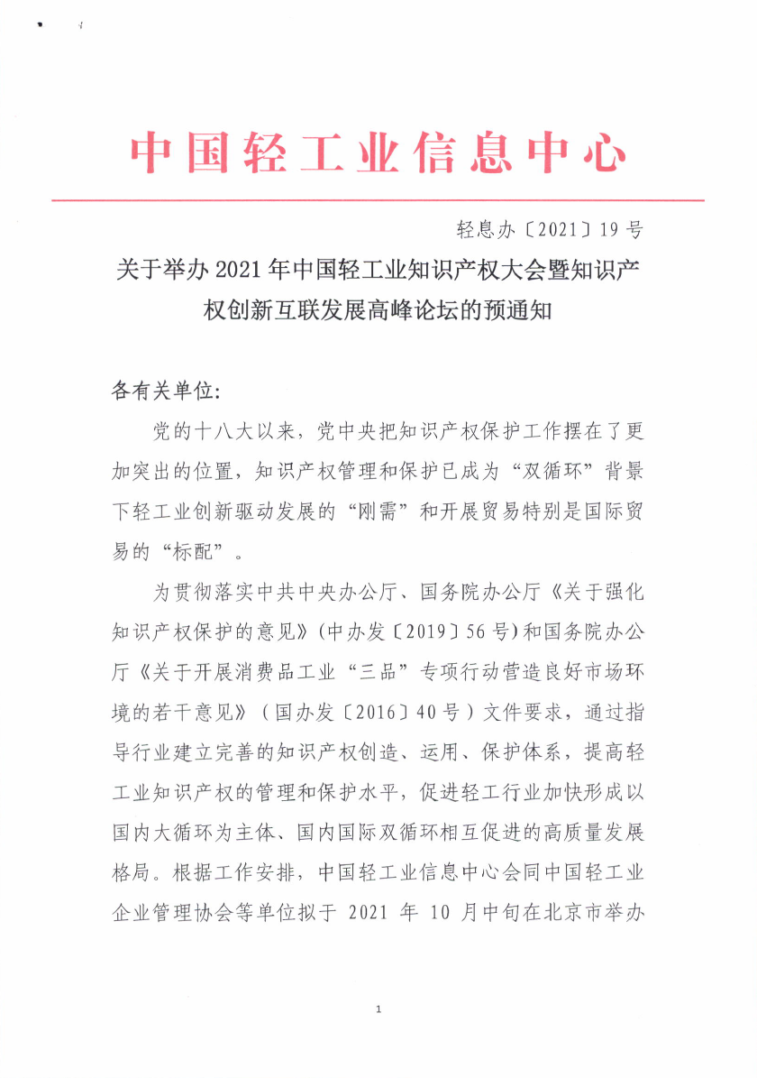 关于举办2021年中国轻工业知识产权大会暨知识产权创新互联发展高峰论坛的预通知