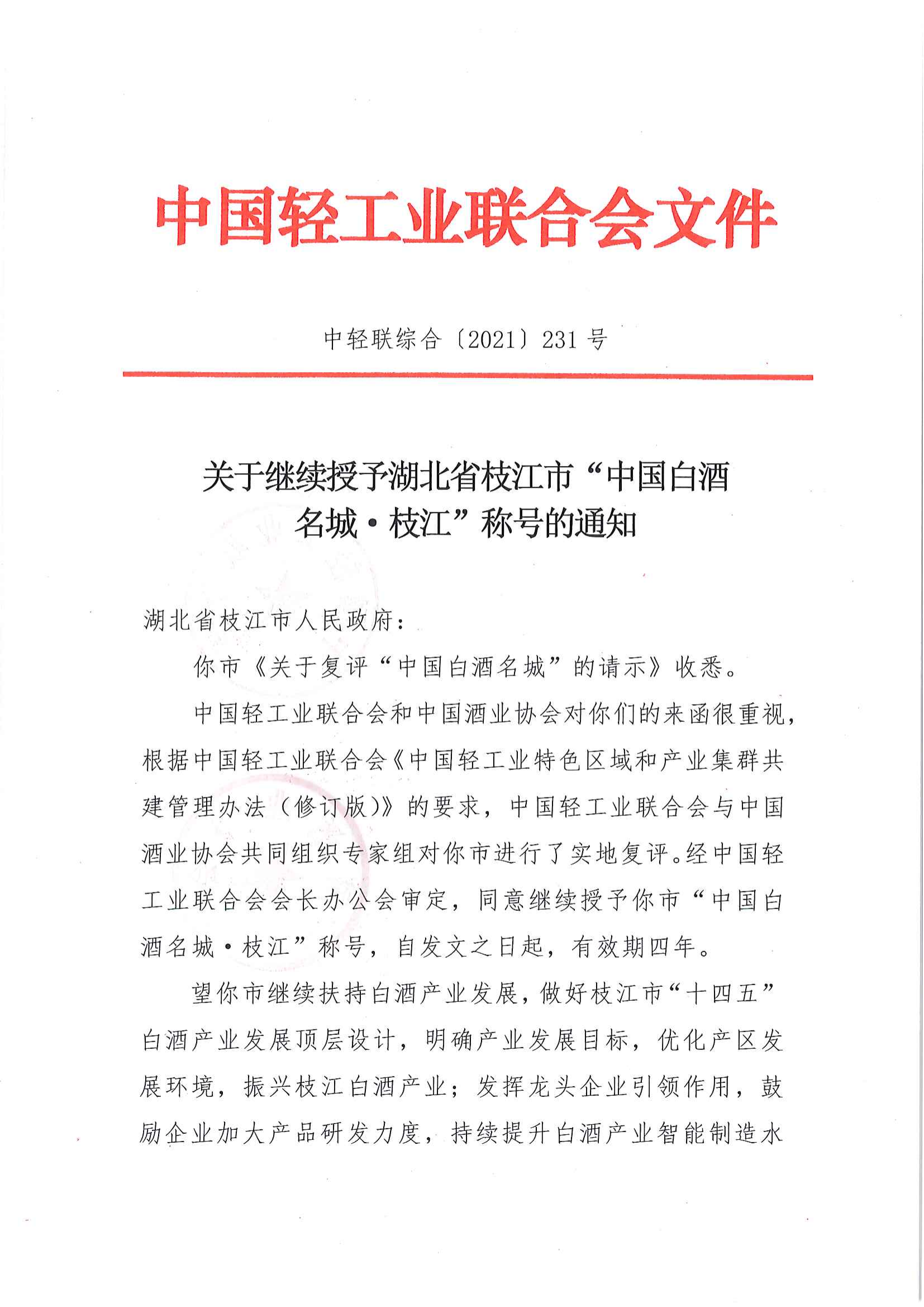关于继续授予湖北省枝江市“中国白酒名城·枝江”称号的通知