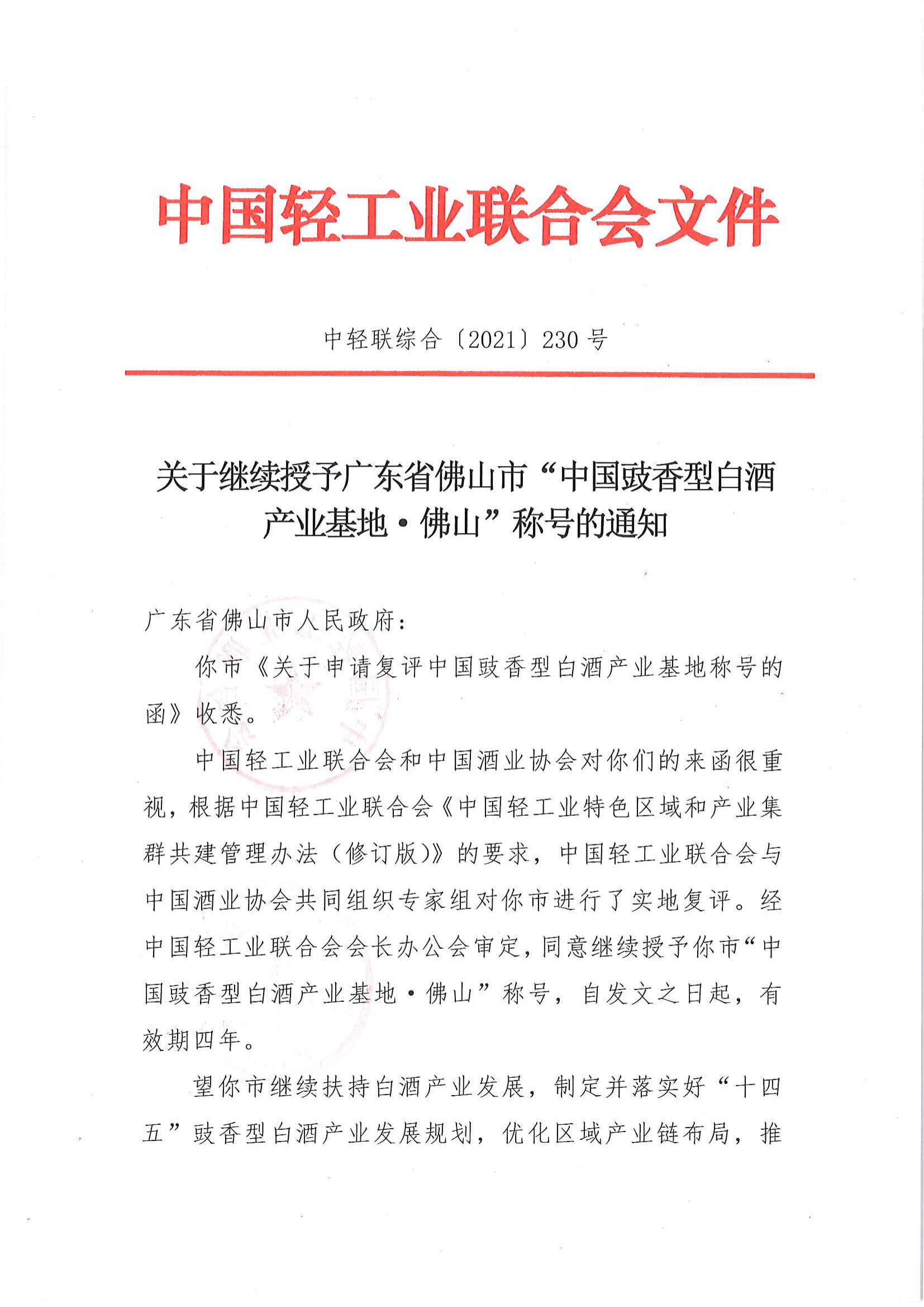 关于继续授予广东省佛山市“中国豉香型白酒产业基地·佛山”称号的通知