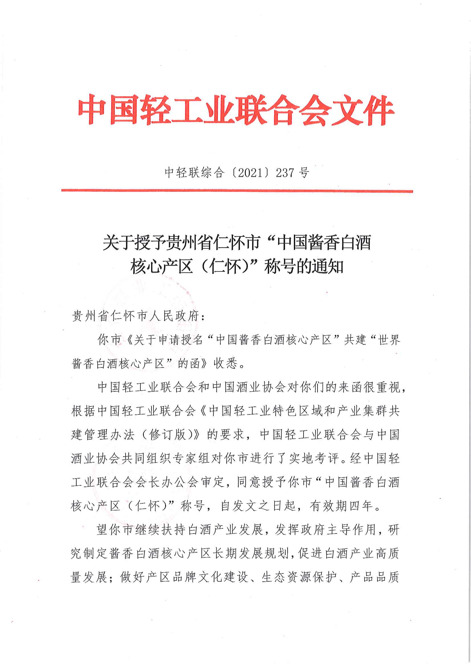 关于授予贵州省仁怀市“中国酱香白酒核心产区(仁怀)”称号的通知