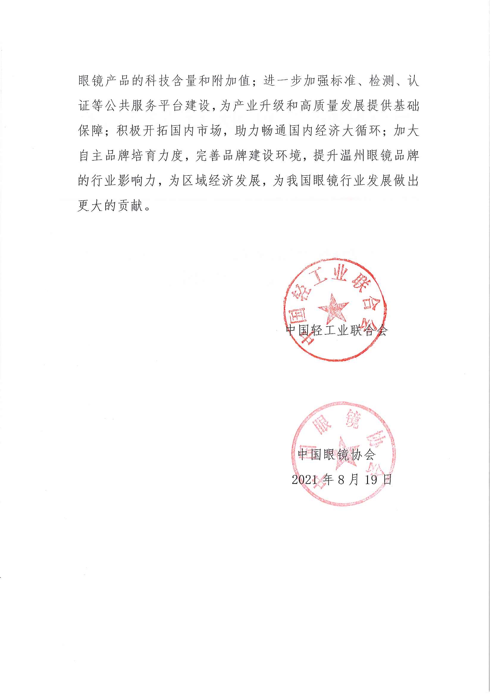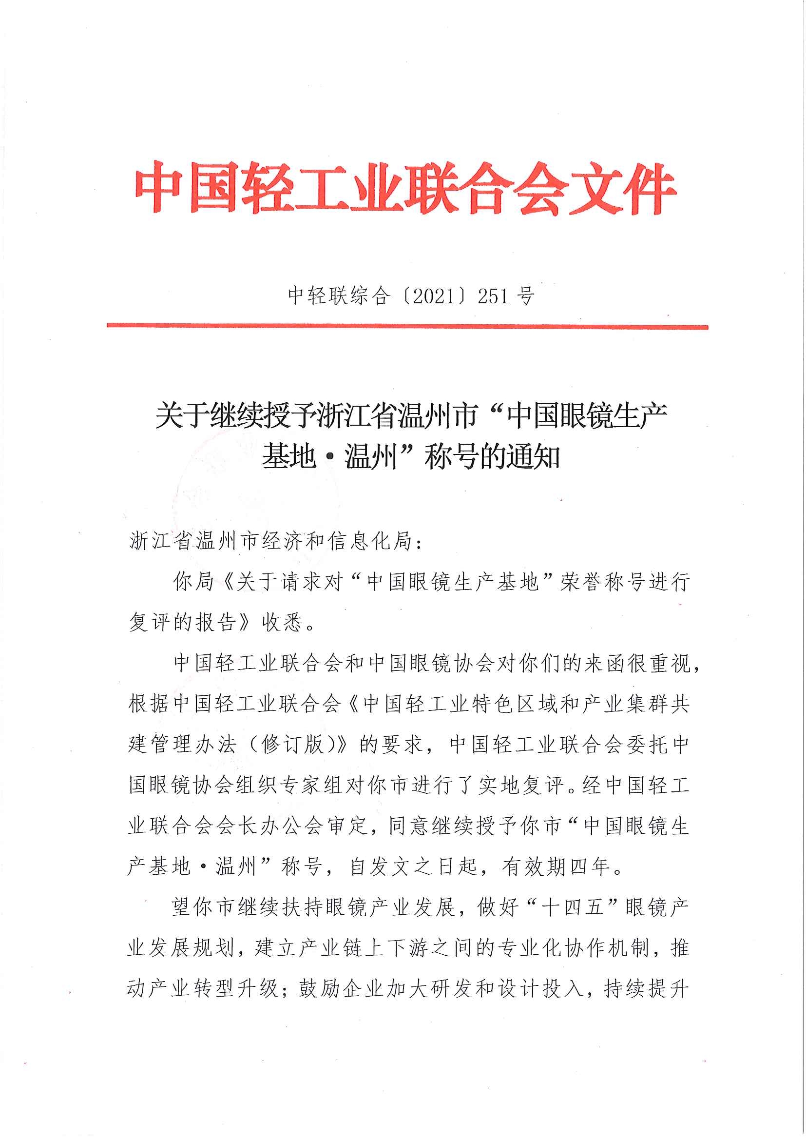 关于继续授予浙江省温州市“中国眼镜生产基地·温州”称号的通知