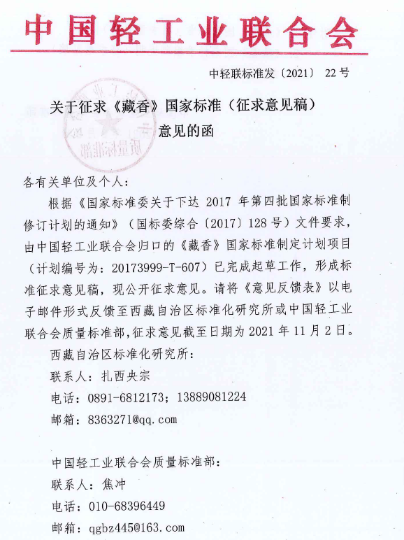 关于征求《藏香》国家标准(征求意见稿)意见的函