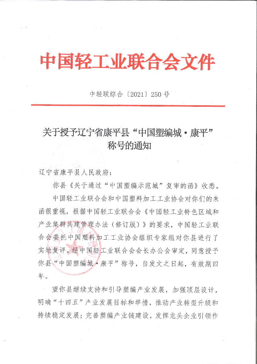 关于授予辽宁省康平县“中国塑编城·康平” 称号的通知