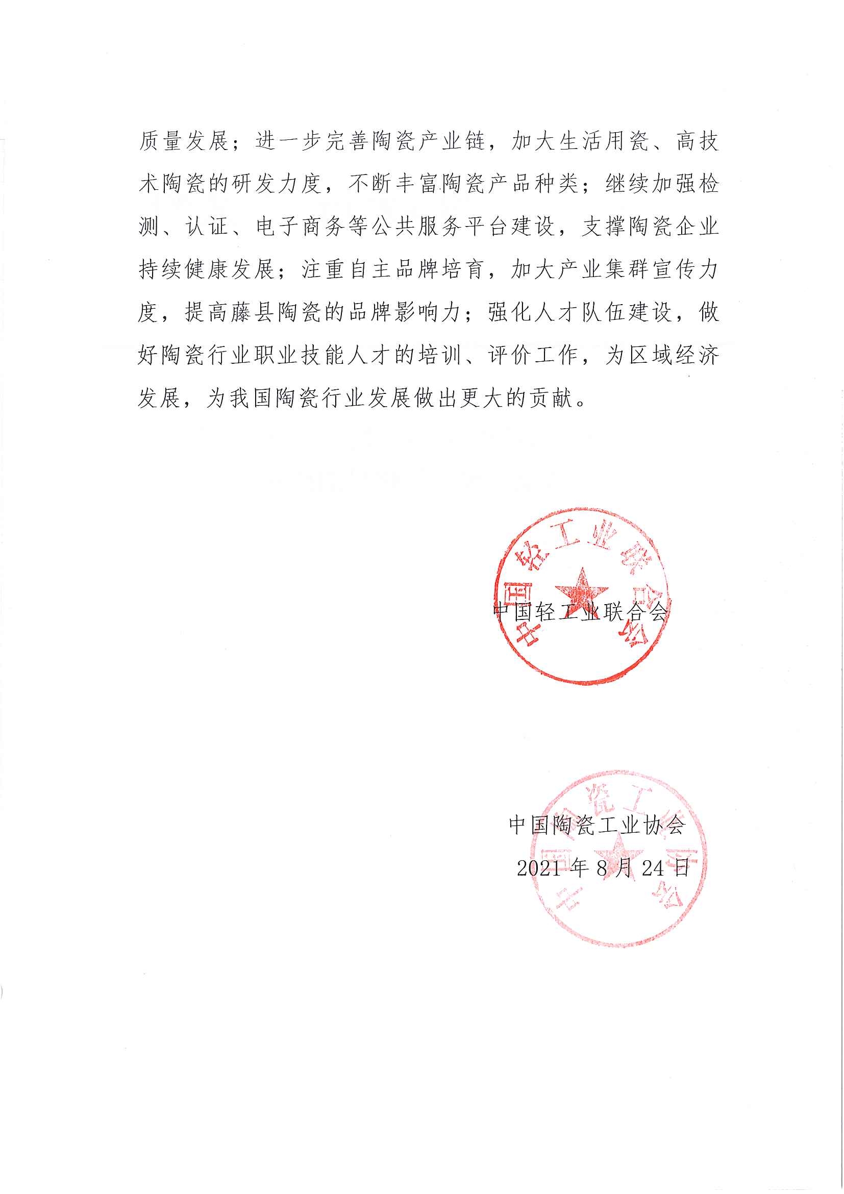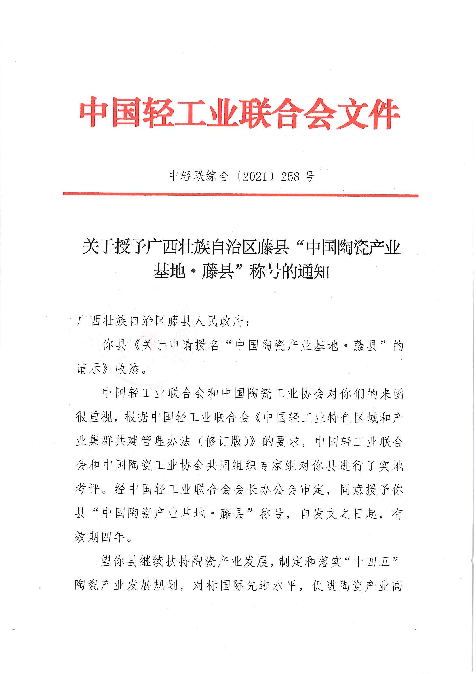 关于授予广西壮族自治区藤县“中国陶瓷产业基地·藤县”称号的通知