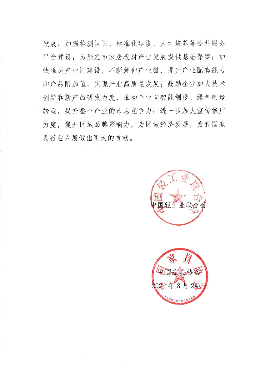 关于授予广西壮族自治区崇左市“中国家居板材产业基地·崇左”称号的通知