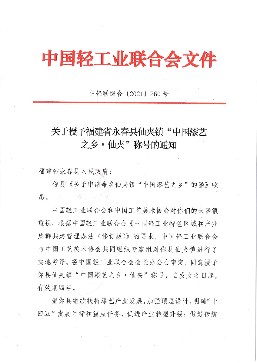 关于授予福建省永春县仙夹镇“中国漆艺之乡·仙夹”称号的通知