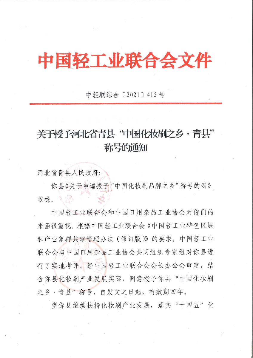 关于授予河北省青县“中国化妆刷之乡·青县”称号的通知
