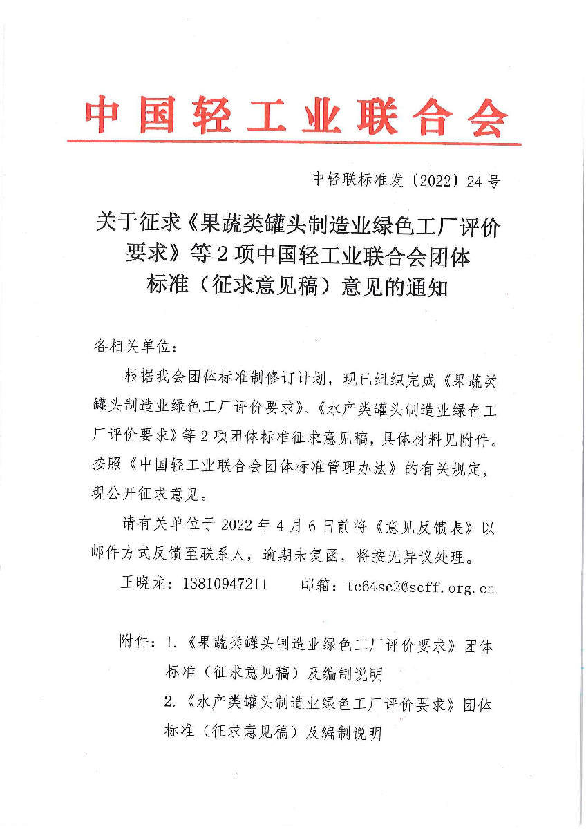 关于征求《果蔬类罐头制造业绿色工厂评价要求》等2项团体标准(征求意见稿)意见的通知