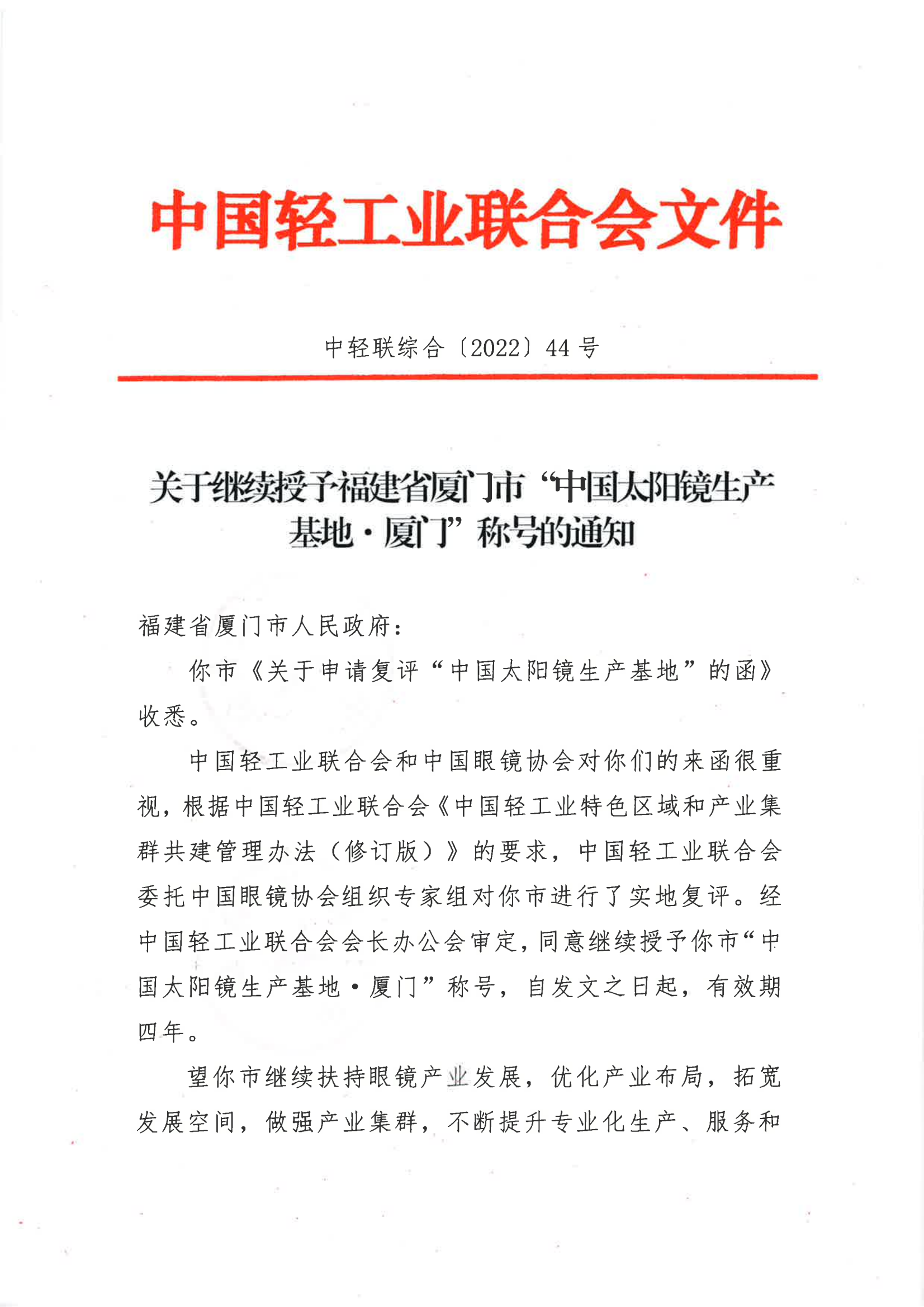 关于继续授予福建省厦门市“中国太阳镜生产基地·厦门”称号的通知