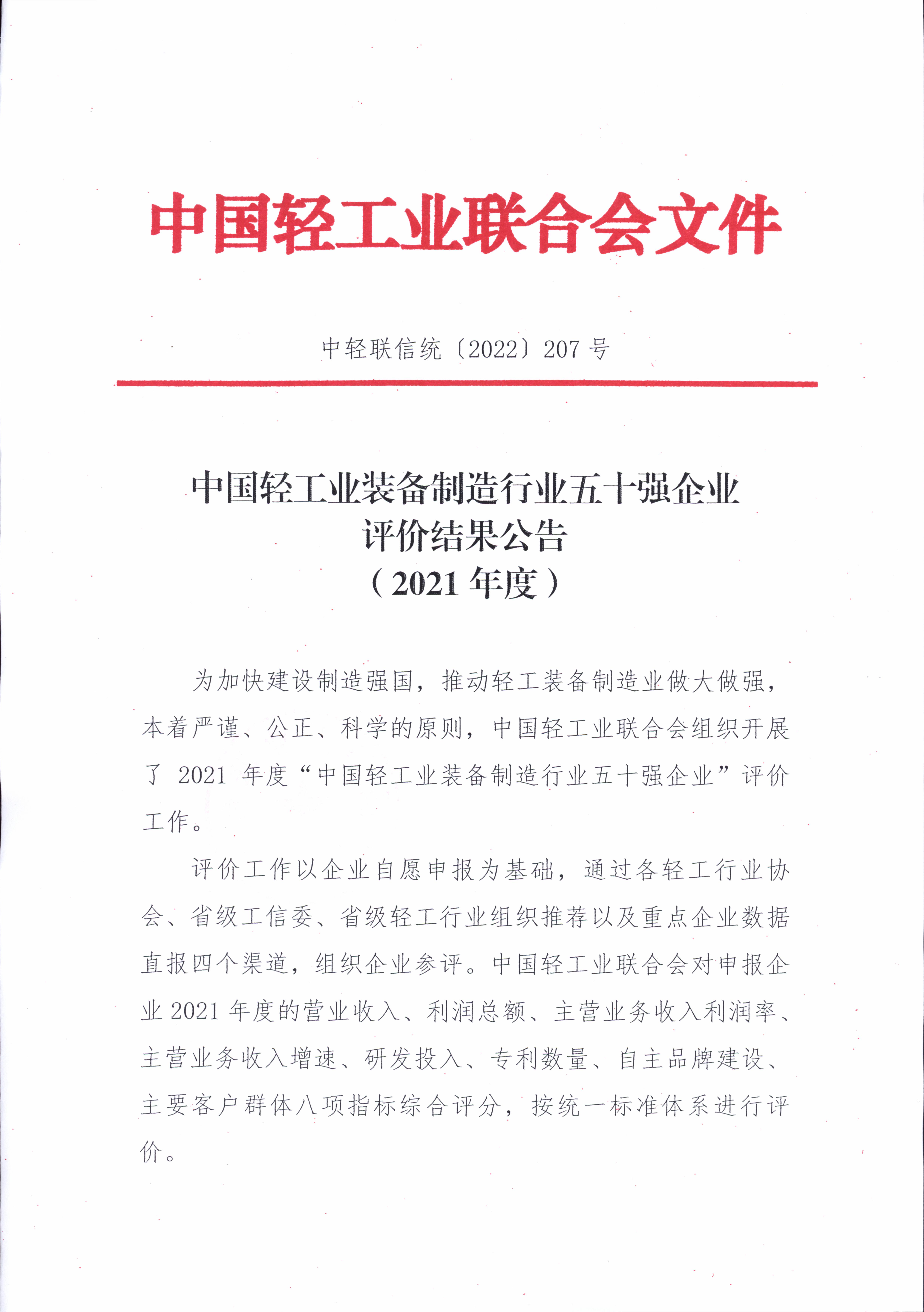 中国轻工业装备制造行业五十强企业评价结果公告(2021年度)