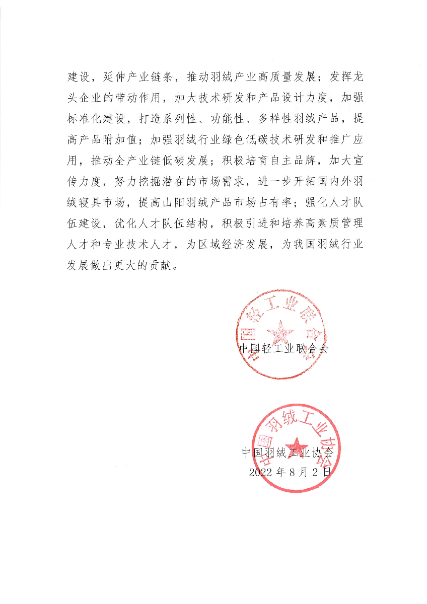 关于继续授予江苏省宝应县山阳镇“中国羽绒名镇·山阳”称号的通知