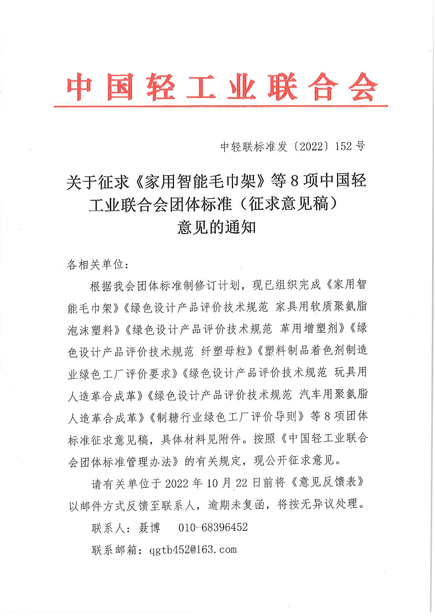 关于征求《家用智能毛巾架》等8项 团体标准(征求意见稿)意见的通知