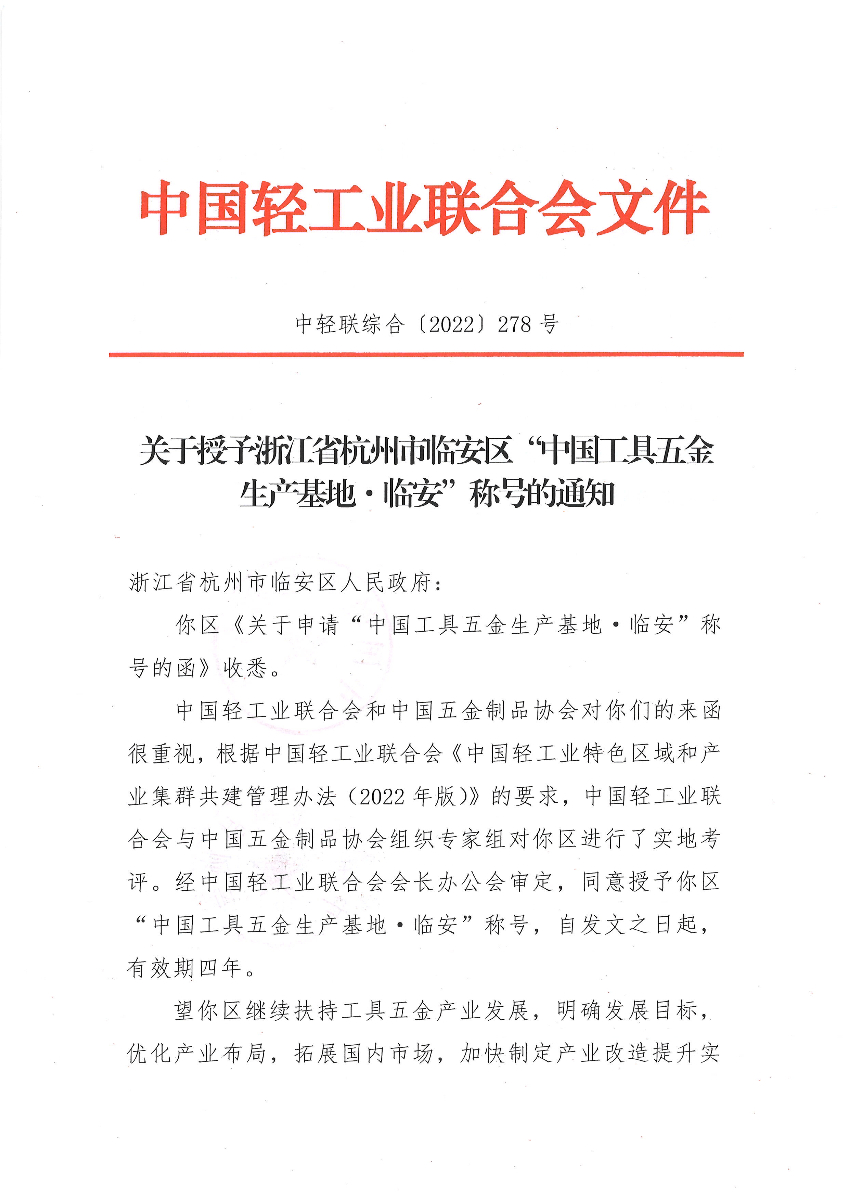 关于授予浙江省杭州市临安区“中国工具五金生产基地·临安”称号的通知