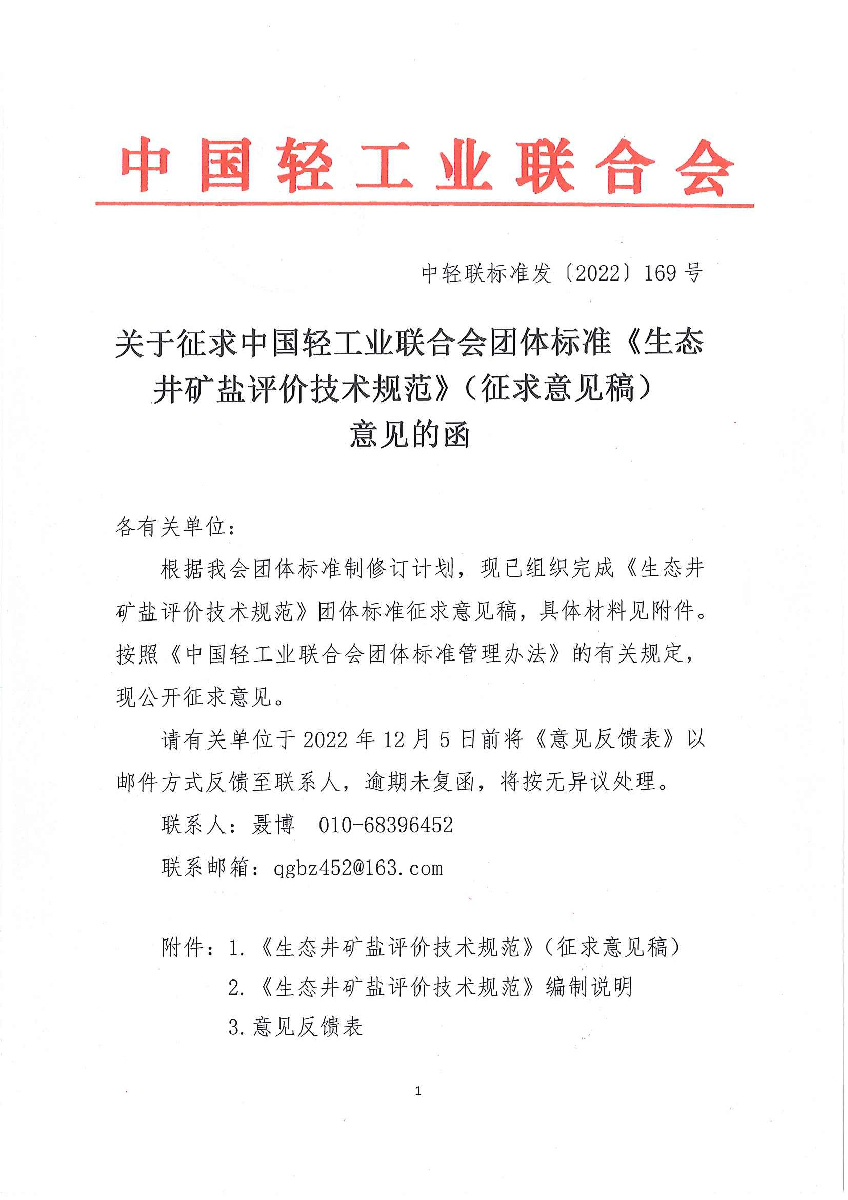 | 1、 | 《生态井矿盐评价技术规范》团体标准(征求意见稿) |