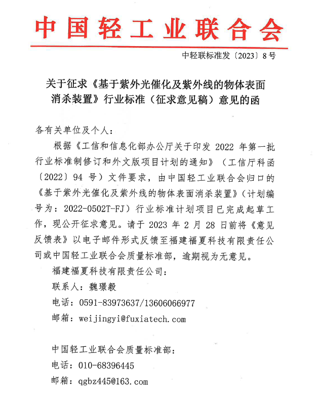 关于征求《基于紫外光催化及紫外线的物体表面消杀装置》行业标准(征求意见稿)意见的函
