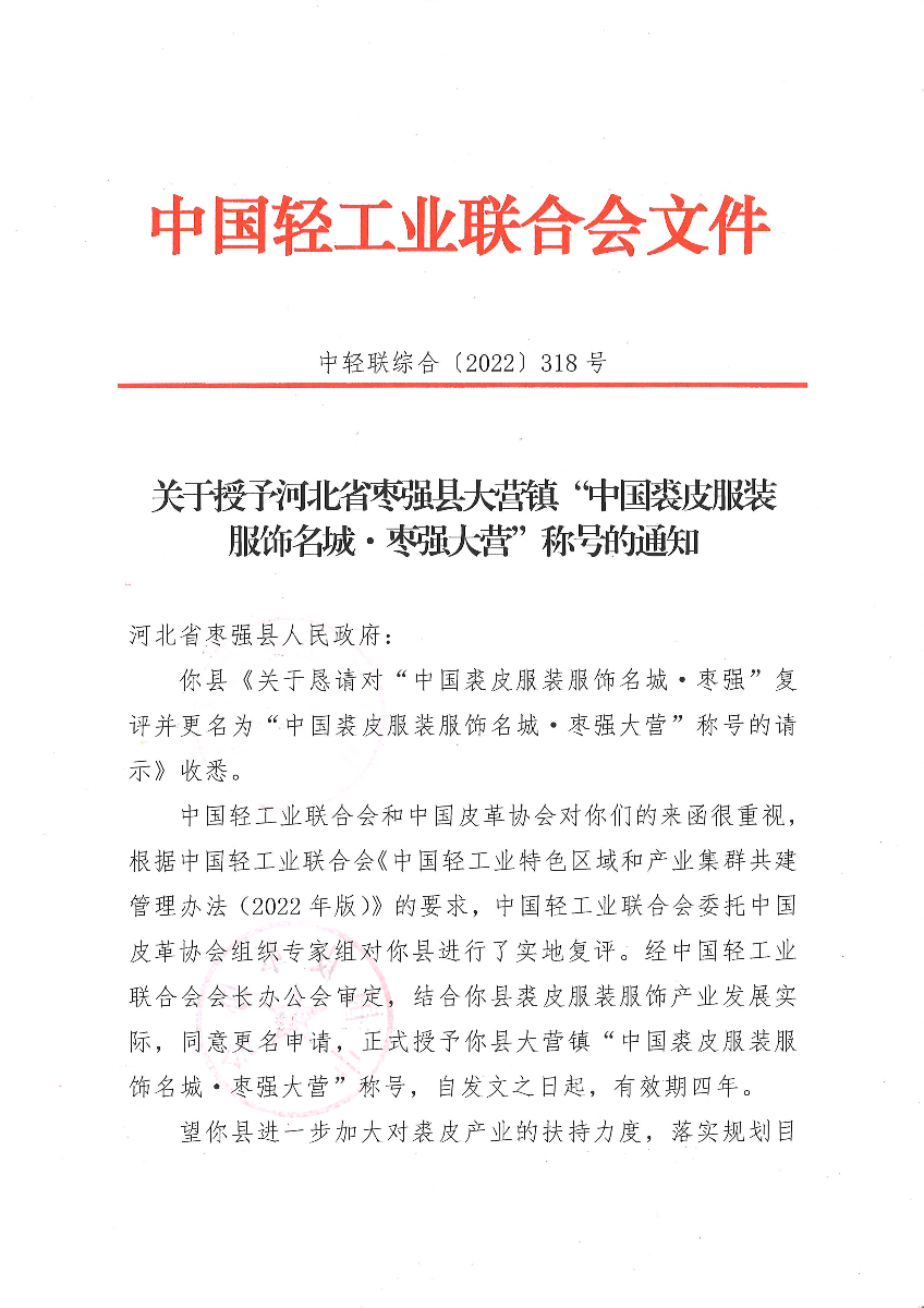 关于授予河北省枣强县大营镇“中国裘皮服装服饰名城·枣强大营”称号的通知