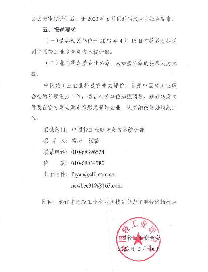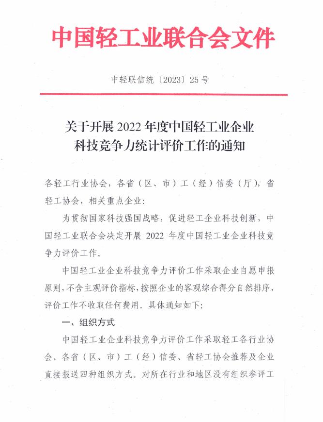 关于开展2022年度中国轻工业企业科技竞争力统计评价工作的通知
