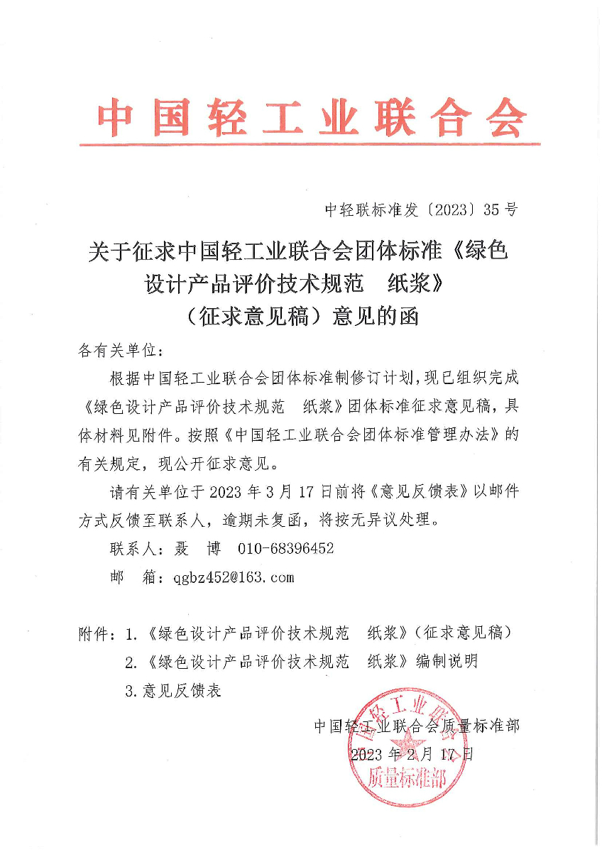 关于征求 团体标准《绿色设计产品评价技术规范 纸浆》(征求意见稿)意见的函