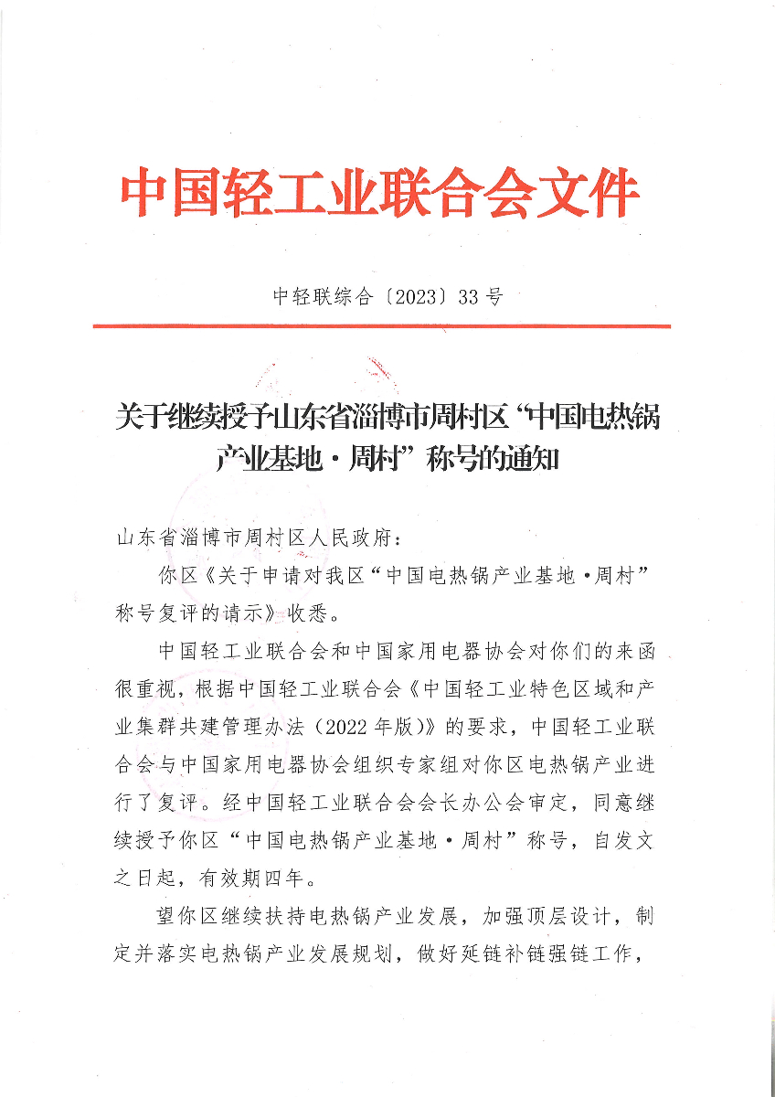 关于继续授予山东省淄博市周村区“中国电热锅产业基地·周村”称号的通知