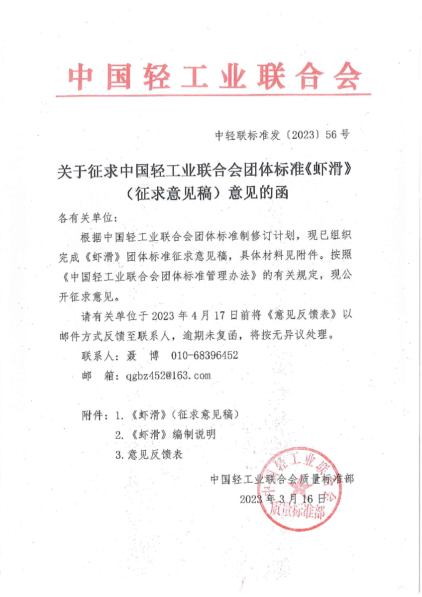 关于征求 团体标准《虾滑》(征求意见稿)意见的函