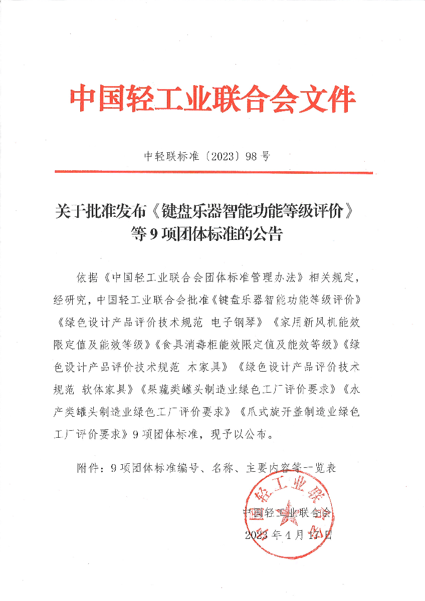 关于批准发布《键盘乐器智能功能等级评价》等9项团体标准的公告