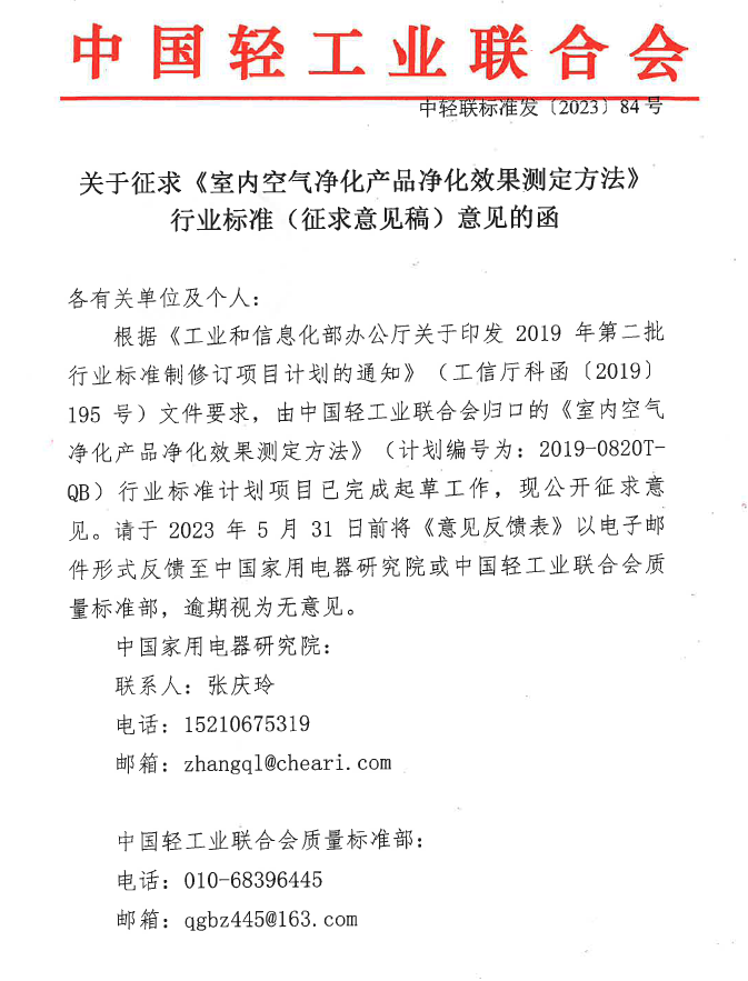 关于征求《室内空气净化产品净化效果测定方法》行业标准(征求意见稿)意见的函