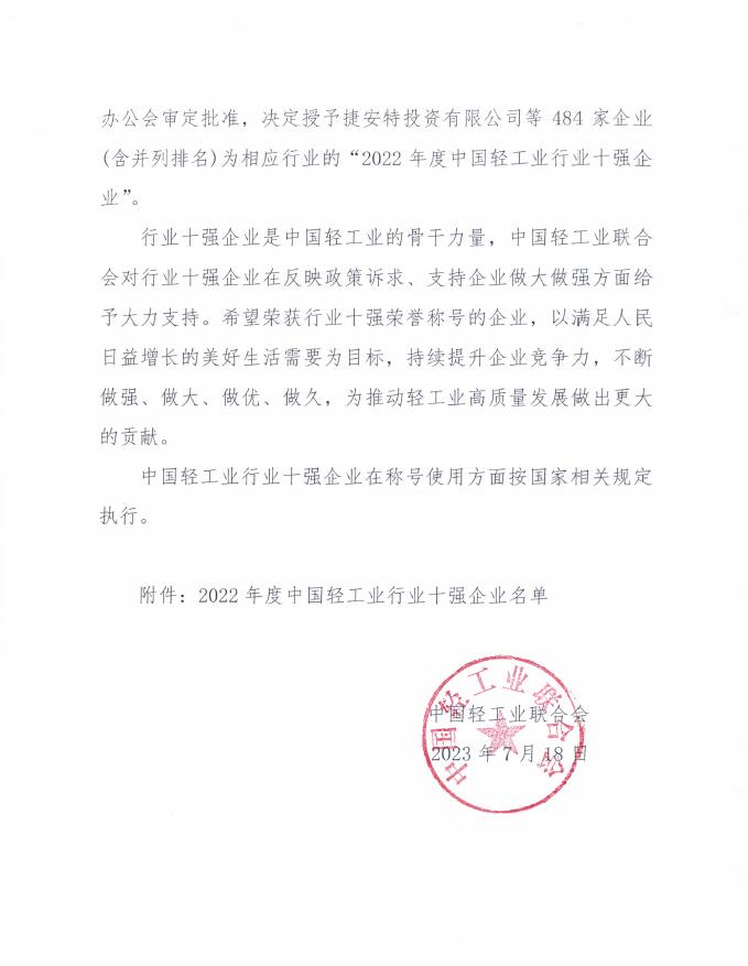 中国轻工业行业十强企业统计评价结果公告(2022年度)