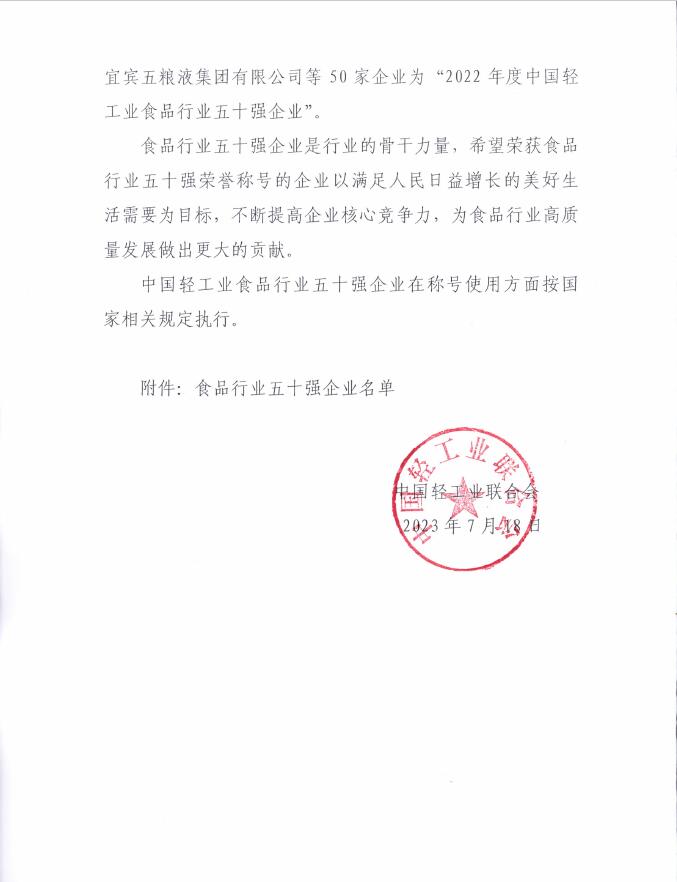 | 1、 | 中国轻工业食品行业五十强企业统计评价结果公告(2022年度) |
