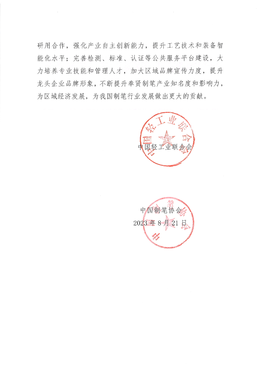关于继续授予上海市奉贤区“中国制笔工业基地(上海·奉贤)”称号的通知
