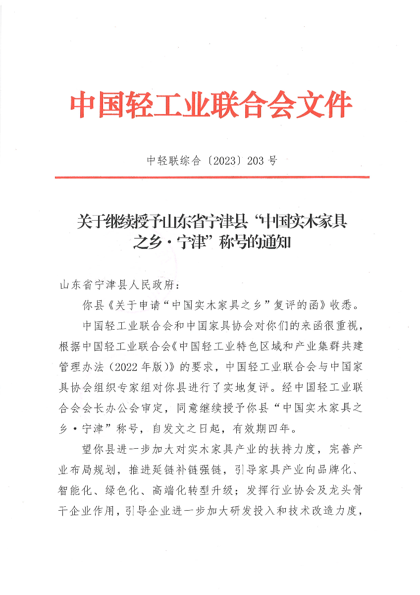 关于继续授予山东省宁津县“中国实木家具之乡·宁津”称号的通知