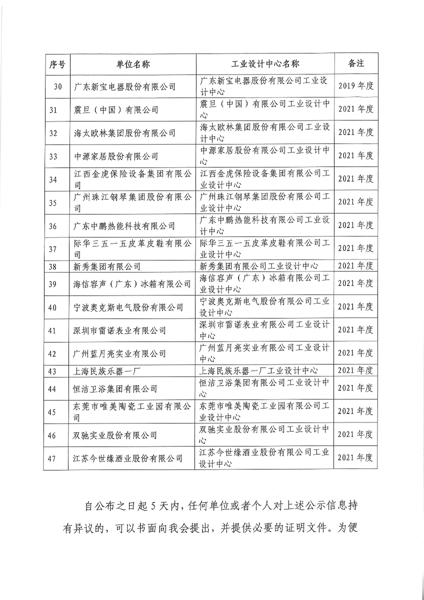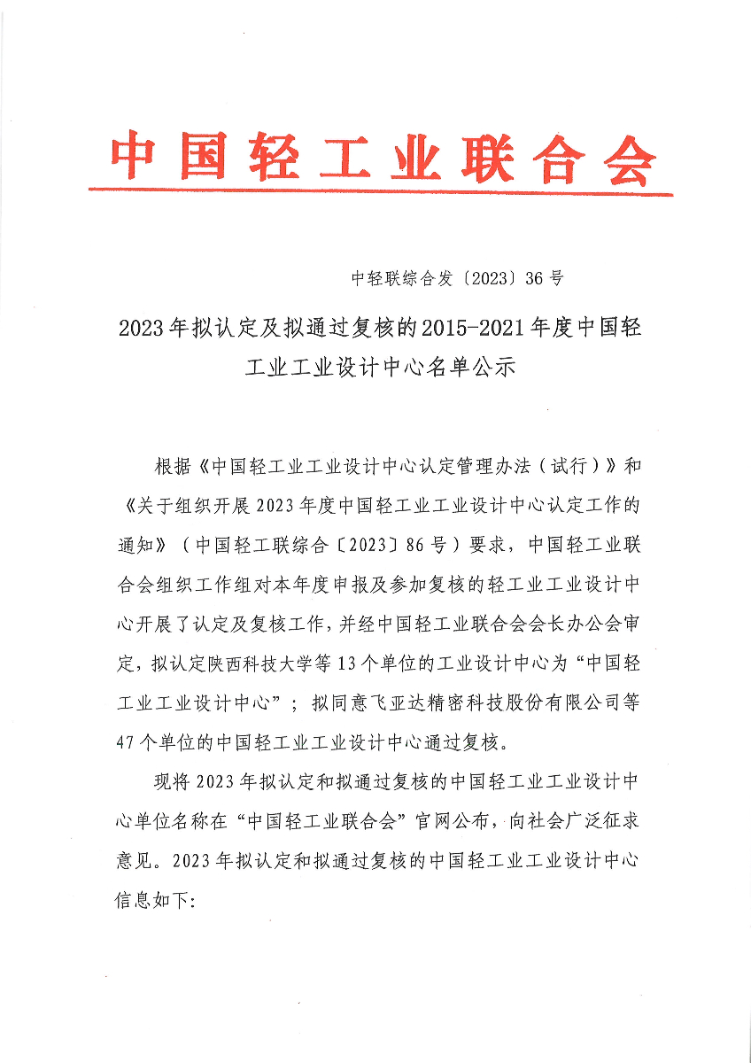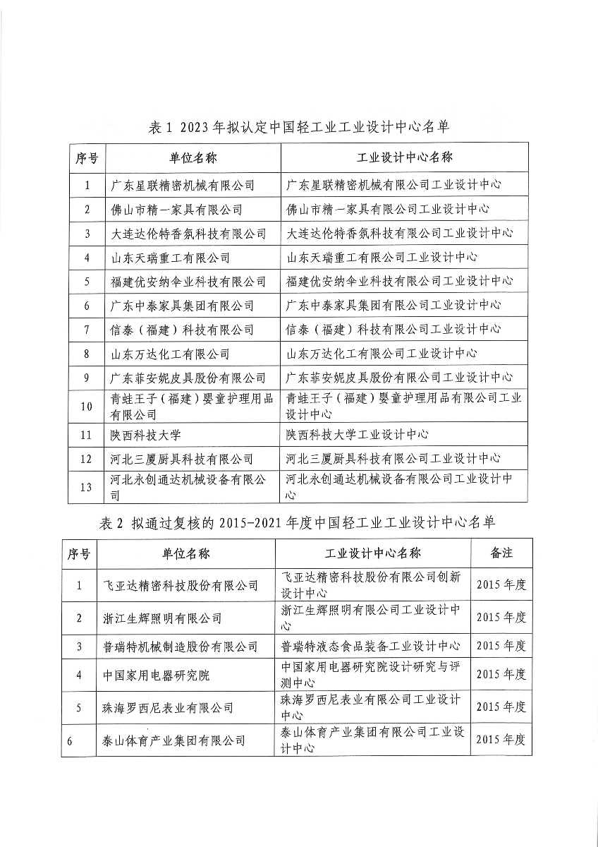 2023年拟认定及拟通过复核的2015-2021年度中国轻工业工业设计中心名单公示