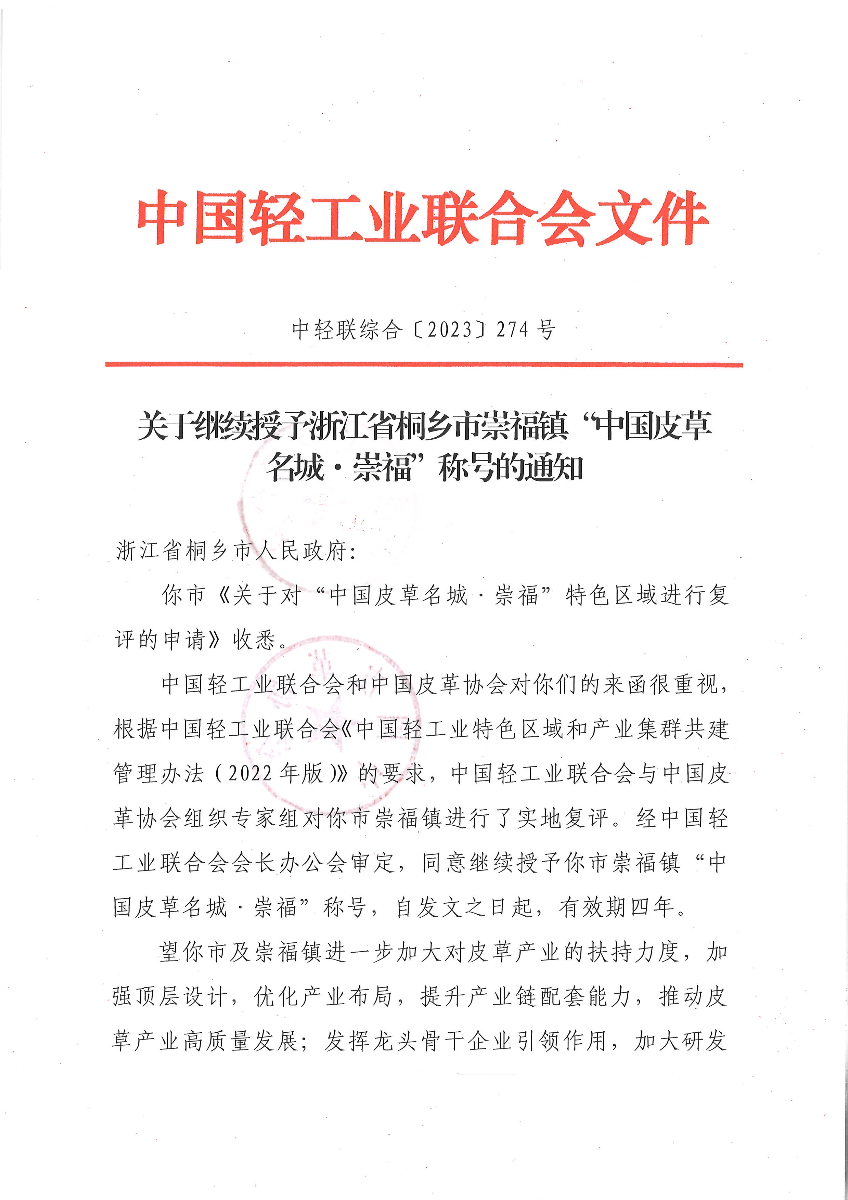 关于继续授予浙江省桐乡市崇福镇“中国皮草名城·崇福”称号的通知