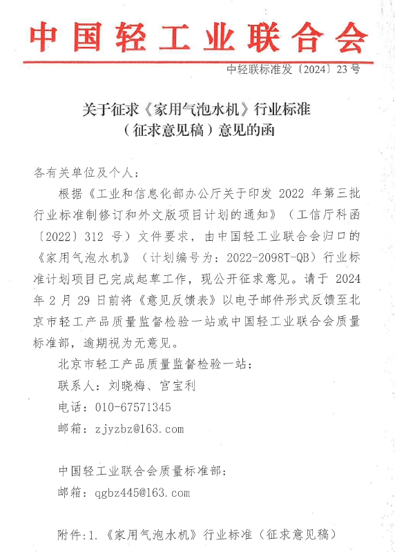 关于征求《家用气泡水机》行业标准(征求意见稿)意见的函