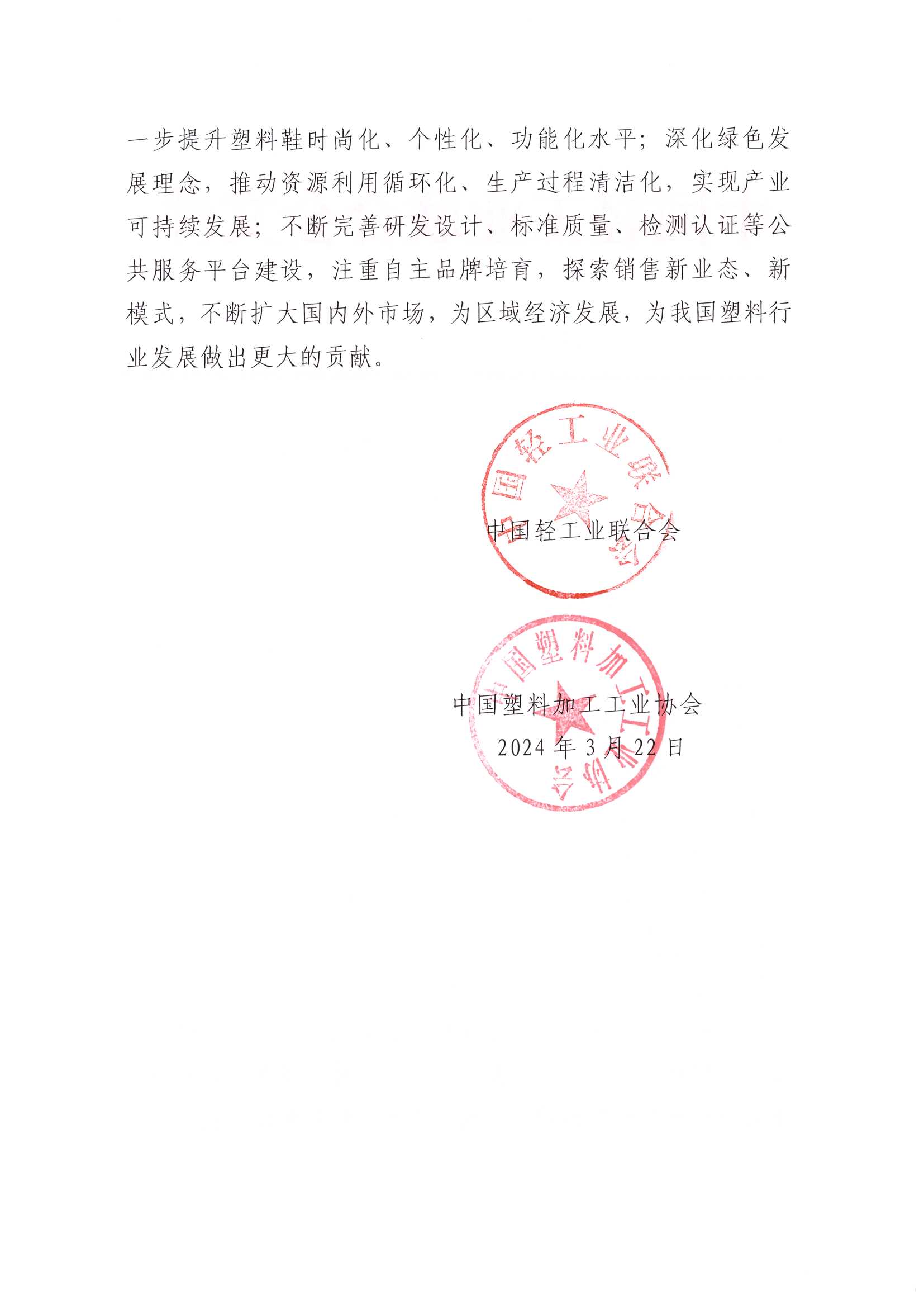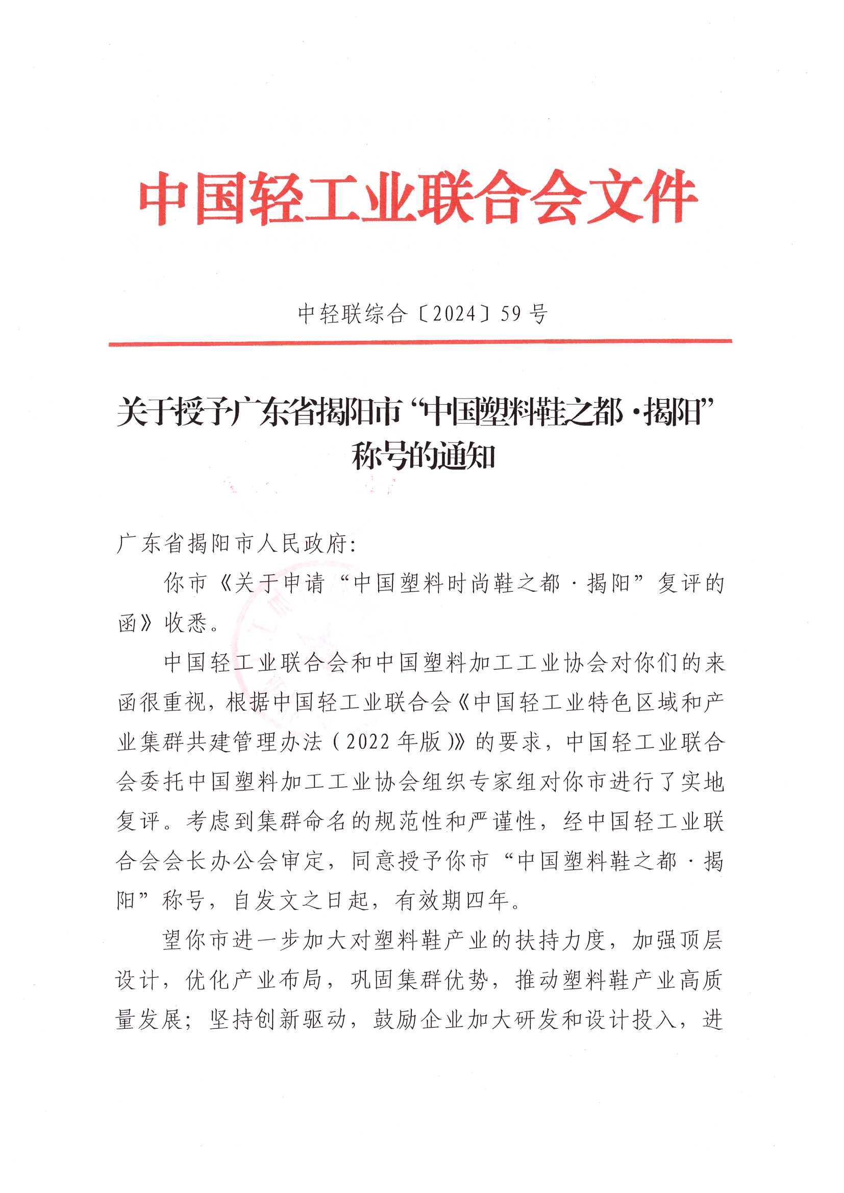 关于授予广东省揭阳市“中国塑料鞋之都·揭阳”称号的通知