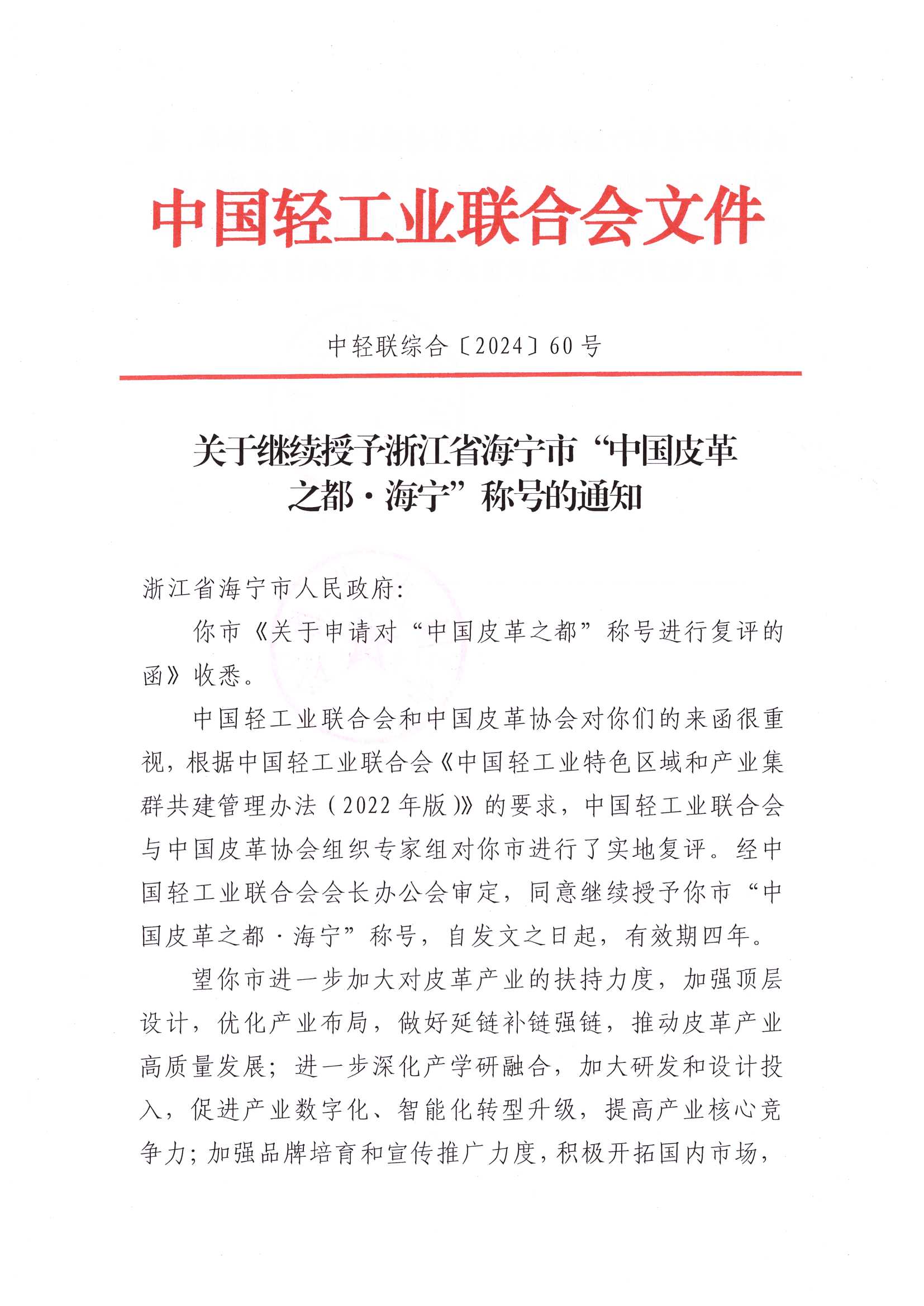 关于继续授予浙江省海宁市“中国皮革之都·海宁”称号的通知